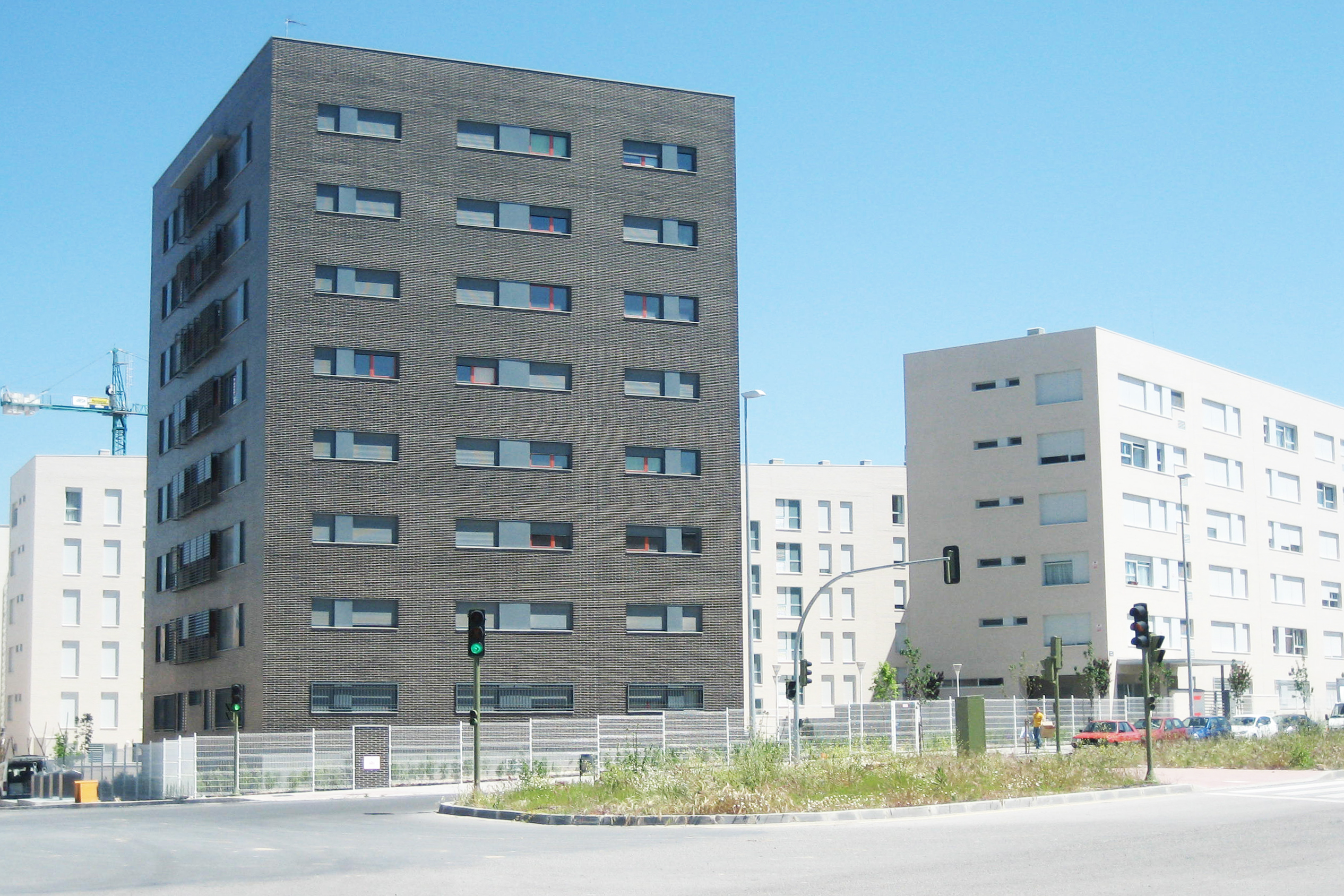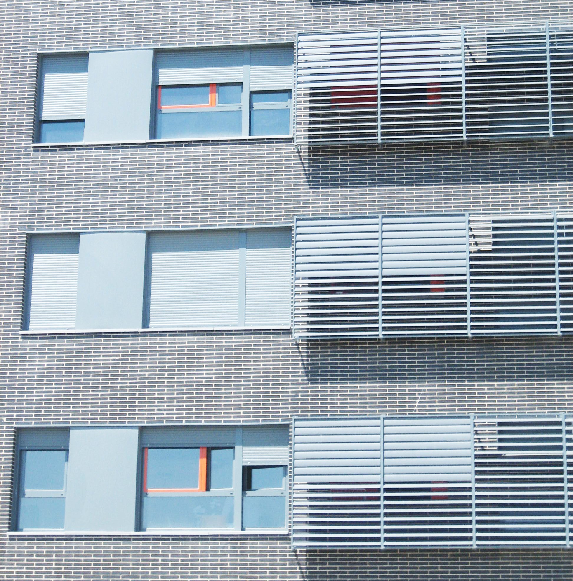 La construcción de estos edificios optimiza la que ha sido casi convención en la vivienda protegida en Madrid durante los últimos 20 años: estructura portante de hormigón armado, cerramiento de fábrica de ladrillo perforado cocido a alta temperatura, transdosado hacia el interior con 6 cm de lana de roca, cámara de aire y revestimiento interior de placa de yeso laminado.