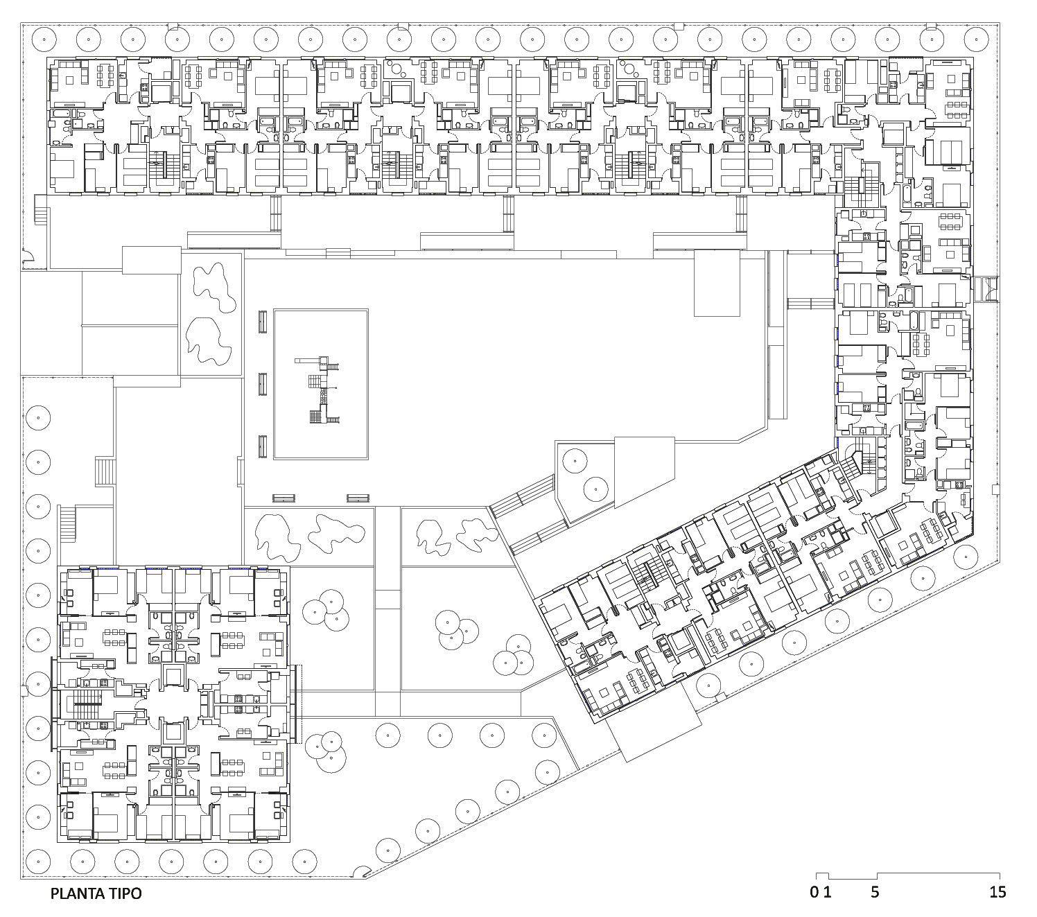 En el bloque se establecen viviendas con ventilación cruzada disponiendo las zonas públicas hacia el patio interno. En la torre, las viviendas se disponen en sus cuatro frentes, con dos orientaciones ortogonales.