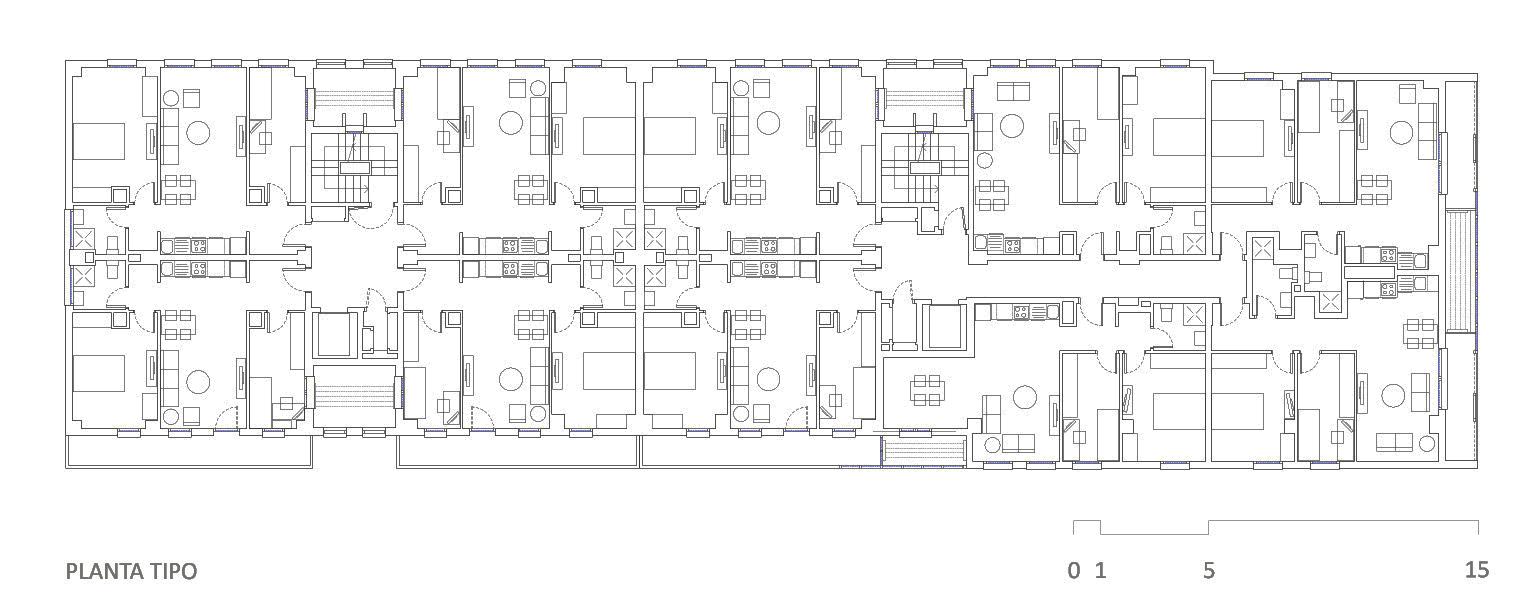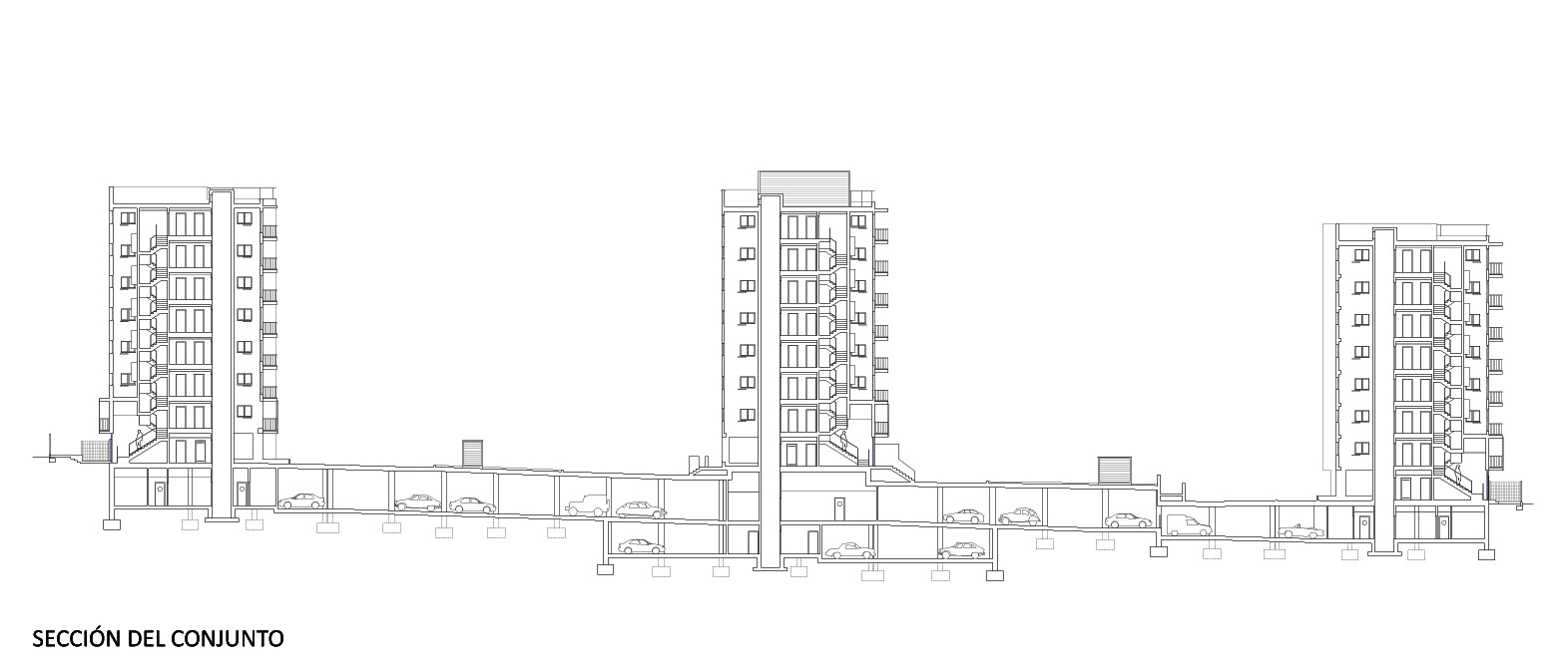 Se trata de Apartamentos destinados al alquiler, con una opción de compra, que han de disponer de una superficie construida máxima de 70 m2 con un programa obligatorio de dos dormitorios, un baño y una estancia con cocina incorporada a ella.Se reduce al mínimo el número de núcleos de comunicación para optimizar el factor Scr/Sur = 1’21.